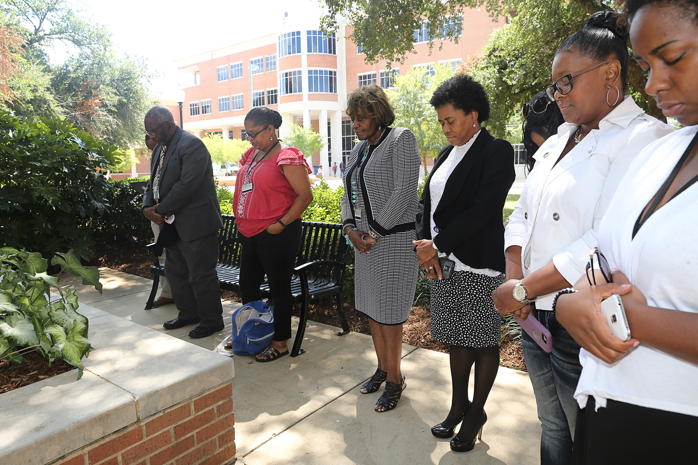 JSU’s Dr. Hilliard Lackey III leads a memorial ceremony for former President Dr. James A. Hefner, who died Thursday, Aug. 27, in Tennessee. The remembrance was held Friday, Aug. 28, in front of Ayer Hall on the main campus. (Photo by Charles A. Smith/JSU)