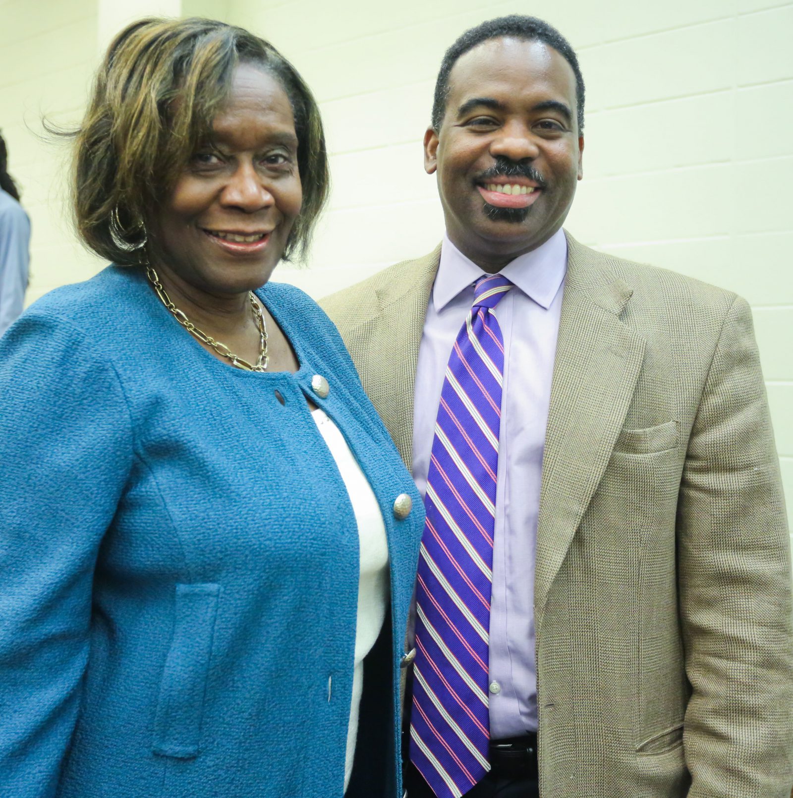 Dr. Evelyn J. Leggette, associate vice president for Academic and Student Affairs and outgoing dean of Undergraduate Studies,  congratulates Dr. Robert Blaine, incoming dean of Undergraduate Studies and CyberLearning, Monday, Jan. 26, 2015, at the Moore Building. (Photo by Charles A. Smith, JSU)
