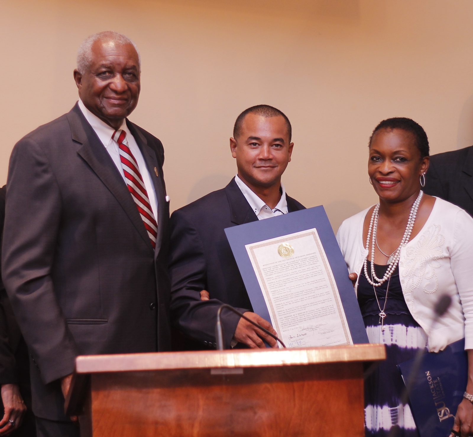 Ward 5 Councilman Charles Tillman presented the proclamation to JSU Head Baseball Coach Omar Johnson and JSU Director of Athletics Vivian L. Fuller.