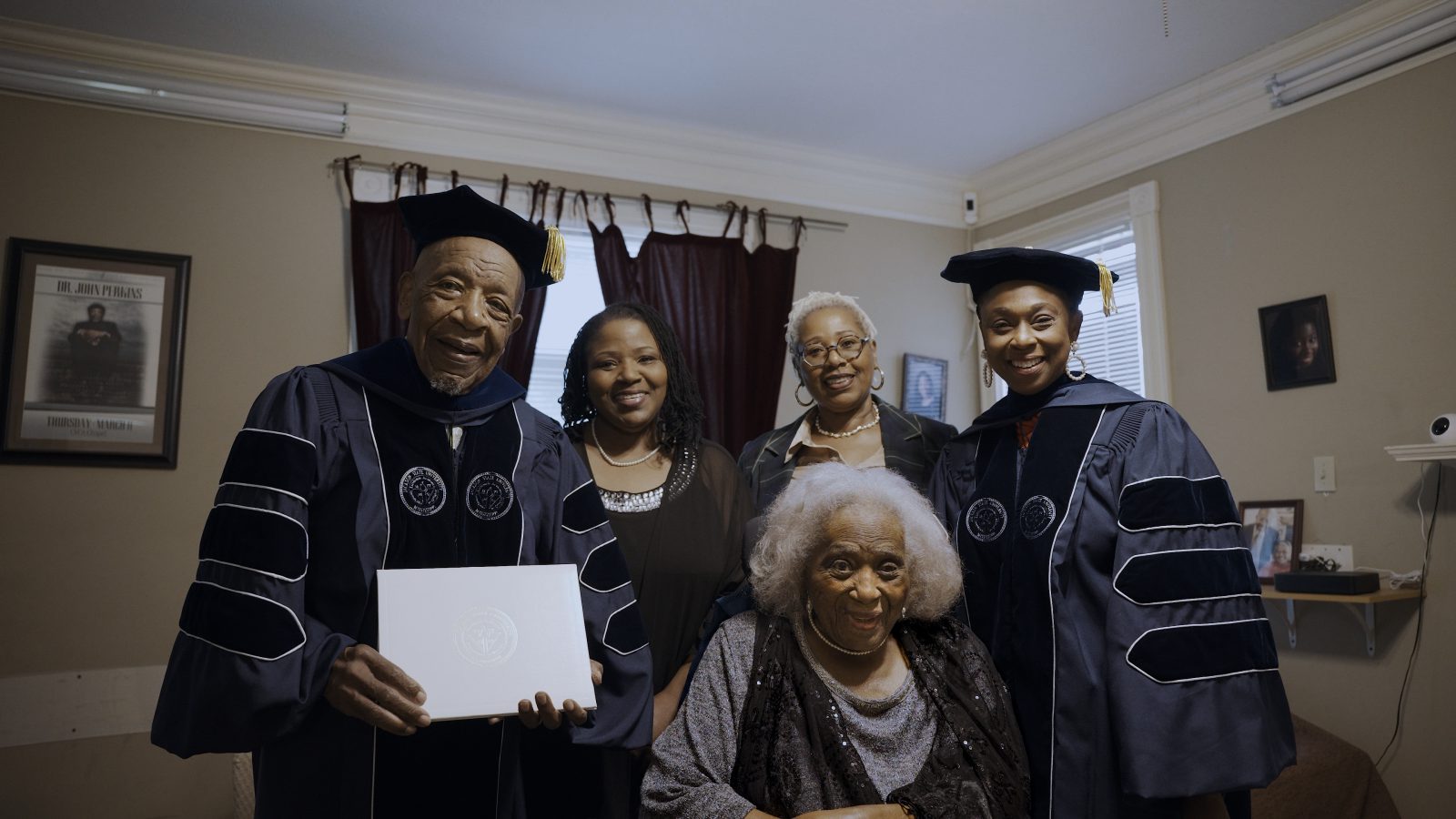 Following the ceremony, Gregory visited Perkins at his Jackson home to present the honorary doctorate in person. The intimate family gathering served as a tribute to his life’s work and a reflection of JSU’s ongoing commitment to community engagement and student leadership. At his home, Gregory and Perkins wore full academic regalia as his daughters stood beside him, and his wife, Vera Mae Perkins, looked on with pride.