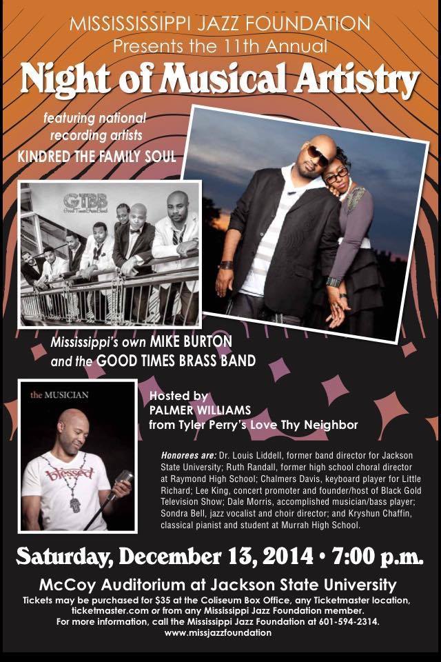 Presented by the Mississippi Jazz Foundation, the 7 p.m. event features Kindred the Family Soul and Mike Burton and the Good Times Brass Band, with actor Palmer Williams Jr. as host.