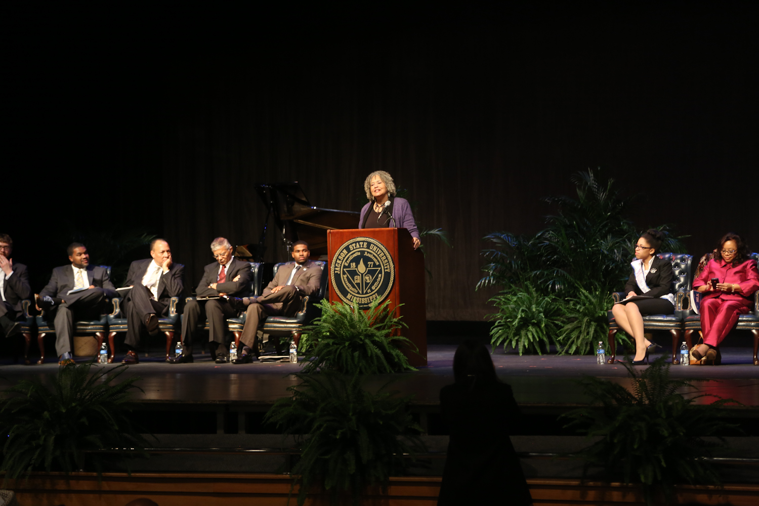 Flanked by JSU Provost James C. Renick and Jackson Mayor Chokwe Lumumba, Hunter-Gault shared her experiences with the movement and explained that she’s devoted her career to the “pursuit of human rights.”