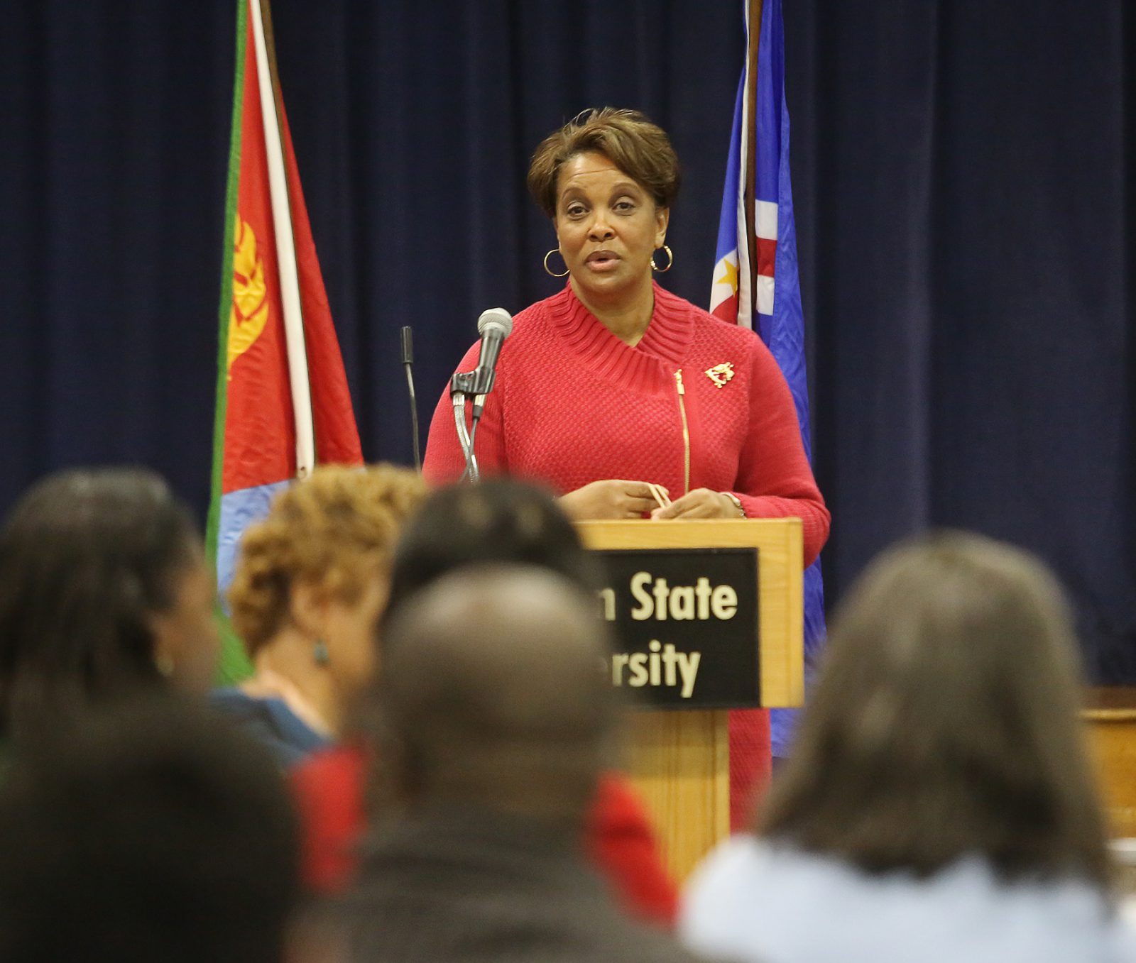 Dr. Shirley Harrison, interim director of the International Programs Office, congratulates English as a Second Language Institute honorees Thursday, Dec. 11, 2014. (Photos by Charles A. Smith, JSU)