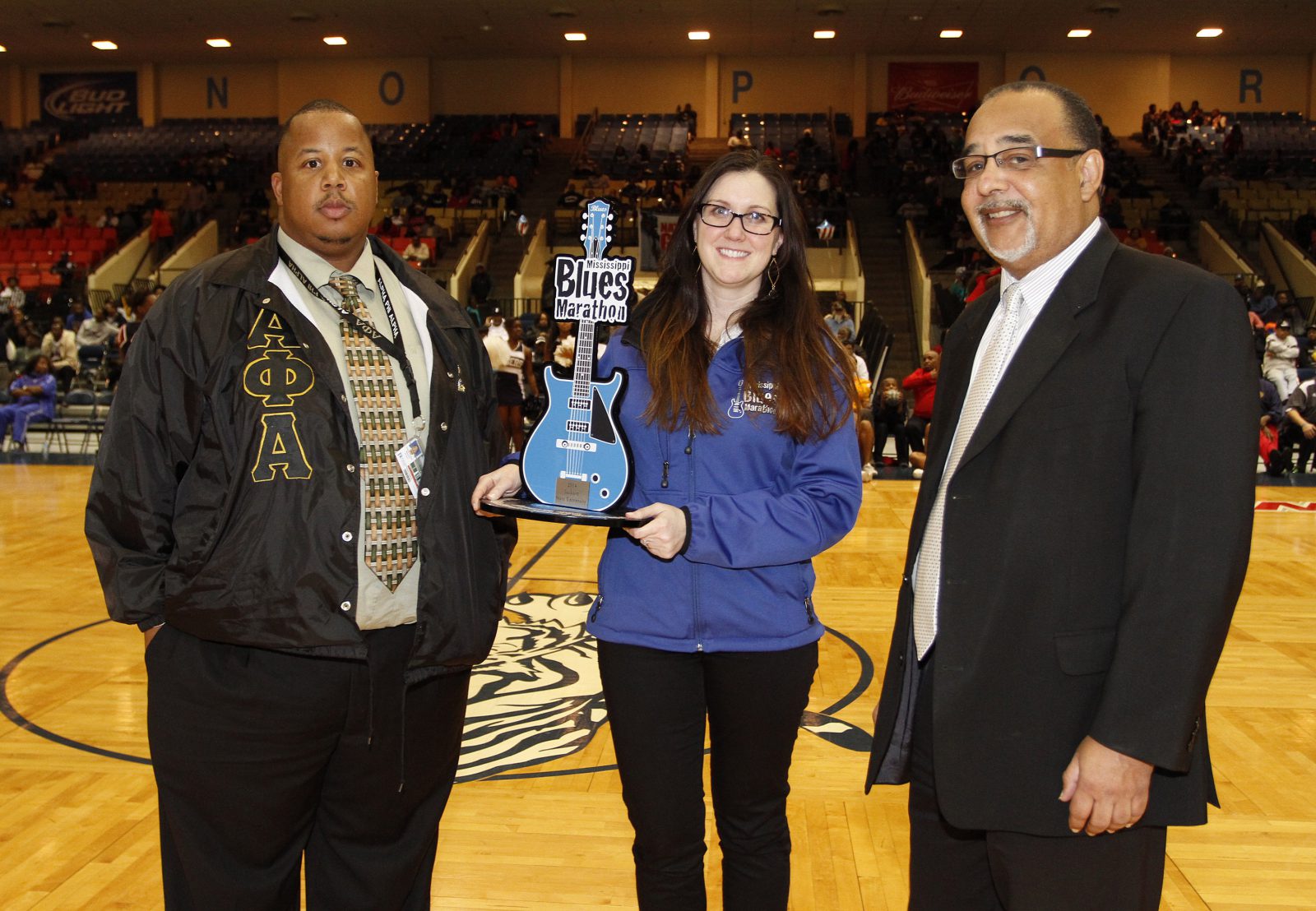 (Charles A. Smith/For the Clarion Ledger)Meredith Virden, manager of corporate communications at Blue Cross & Blue Shield of Mississippi, presents the Mississippi Blues City Marathon Runner’s Choice Award to Jackson State University during Monday night’s basketball game at the Lee E. Williams Athletics and Assembly Center. JSU Assistant Band Director Rodney Chism (left) and Vice President for Institutional Advancement David Hoard (right) accepted the award on the university’s behalf.