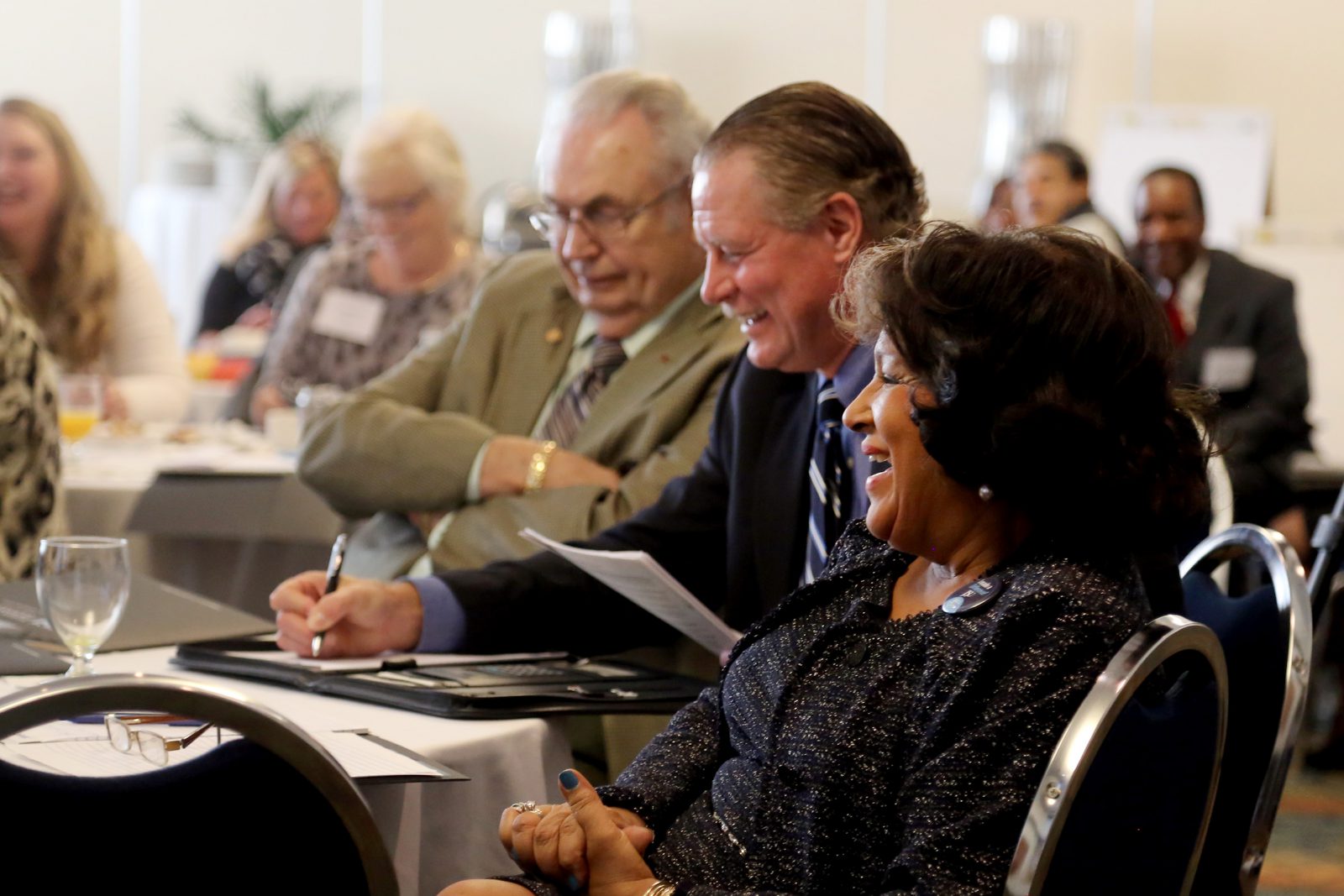 JSU President Dr. Carolyn W. Meyers (right) shares a lighthearted moment with (from left) Dr. Clyde Muse, president of Hinds Community College and Dr. Glen Boyce, associate commissioner of academic and student affairs with the Mississippi Institutions of Higher Learning at the Academic Partnership Program Summit held at JSU on Thursday, Oct. 20, 2014. (Photos by Charles A. Smith)
