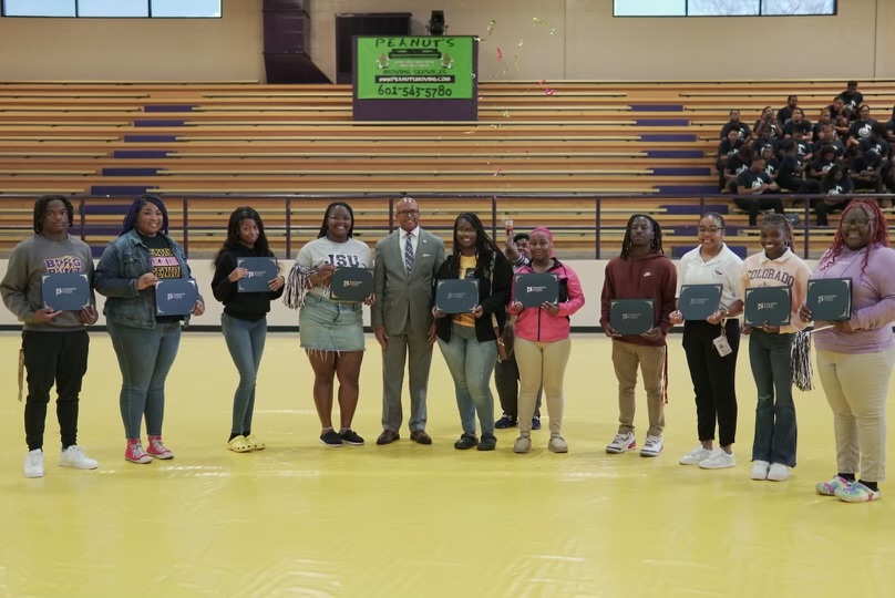 Jackson State University’s Undergraduate Recruitment Takeover Tour is underway, making its first stop in Southwest Mississippi. The delegation of faculty, staff, and student members of the Sonic Boom of the South, Blue Ambassadors, JSU cheerleaders, and the university chorale joined President Marcus Thompson, Ph.D., during stops at Hattiesburg, Laurel, and Heidelberg high schools on Monday, Feb. 26, to inform students as to why they should attend the number one urban research institution in the state.