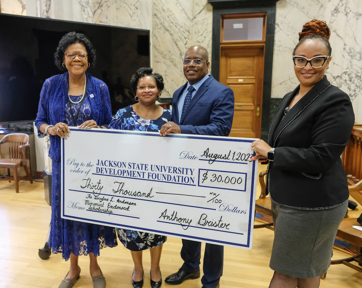 Jackson State University received a $30,000 donation to establish a scholarship in honor of the late Senator Douglas Anderson. The announcement was made during the Senator Douglas Anderson Memorial Highway dedication ceremony by former Hinds County Administrator Anthony Brister as he announced the donation to JSU Acting President Elayne Hayes-Anthony, Ph.D.