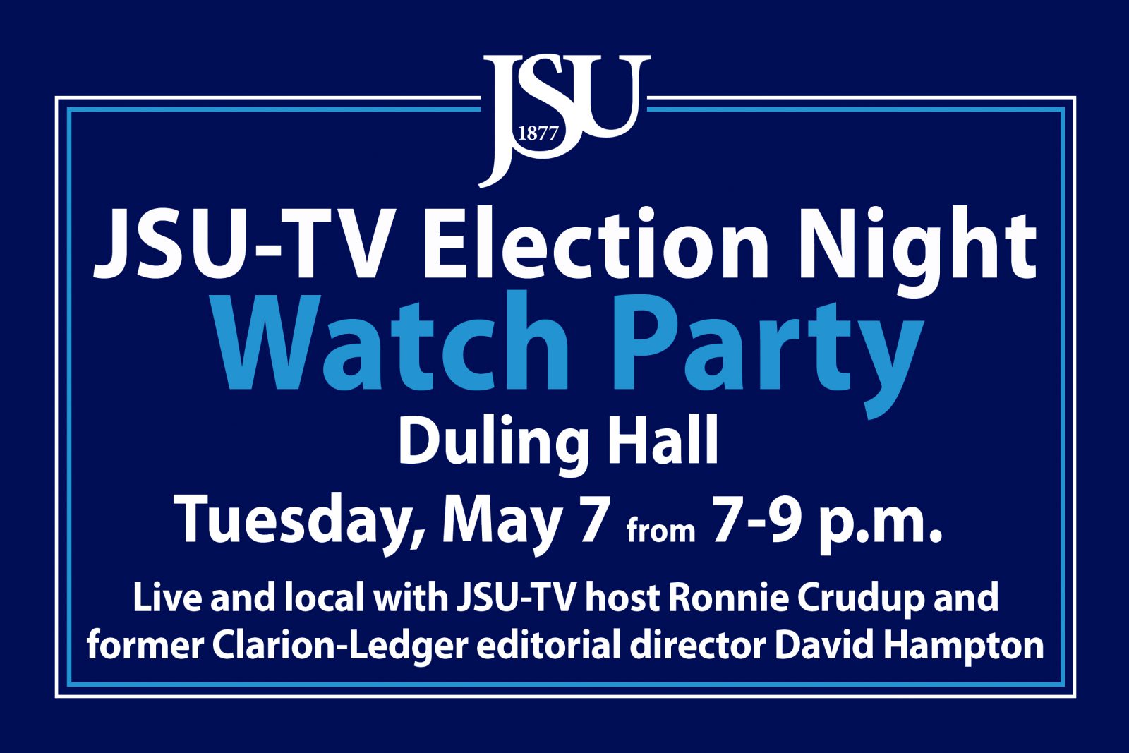 JSU-TV will broadcast election night coverage live from The Auditorium at Duling Elementary in Jackson’s Fondren District. Showtime is scheduled for 7-9 p.m. The broadcast will be aired on Comcast channel 14 and the JSU-TV live-stream at www.livestream.com/jsutelevision.
