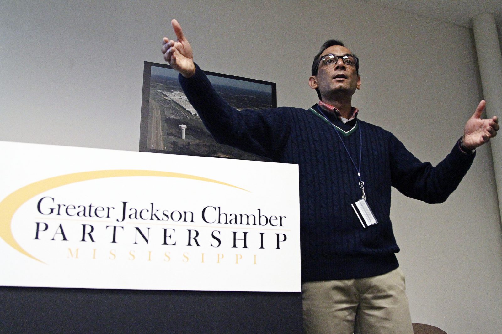 Jackson State University’s Dr. Mukesh Kumar outlines a plan for Jackson revitalization at the Greater Jackson Chamber Partnership offices on Thursday, Feb. 12, 2015. (Photo by Deontae Williams, JSU)