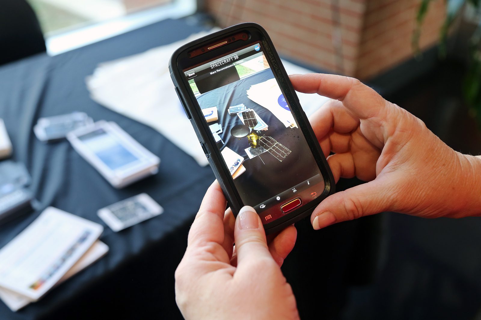 One lure might have been the free smartphone apps that were hot items at the registration desk. Downloadable via cards with qr codes printed on them, the apps can be used to make it appear spacecraft are floating in space in photos taken with smartphones. The Spacecaft 3D apps are also available online, said Singleton.