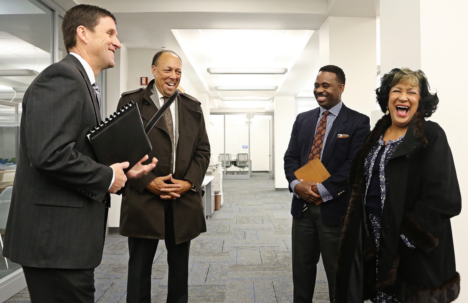 Meyers, Dr. James C. Renick, provost and senior vice president for Academic and Student Affairs, and Dr. Robert Blaine, dean of Undergraduate Studies and CyberLearning, took Bounds on a quick tour of the Innovate center at H.T. Sampson Library, among other spots.