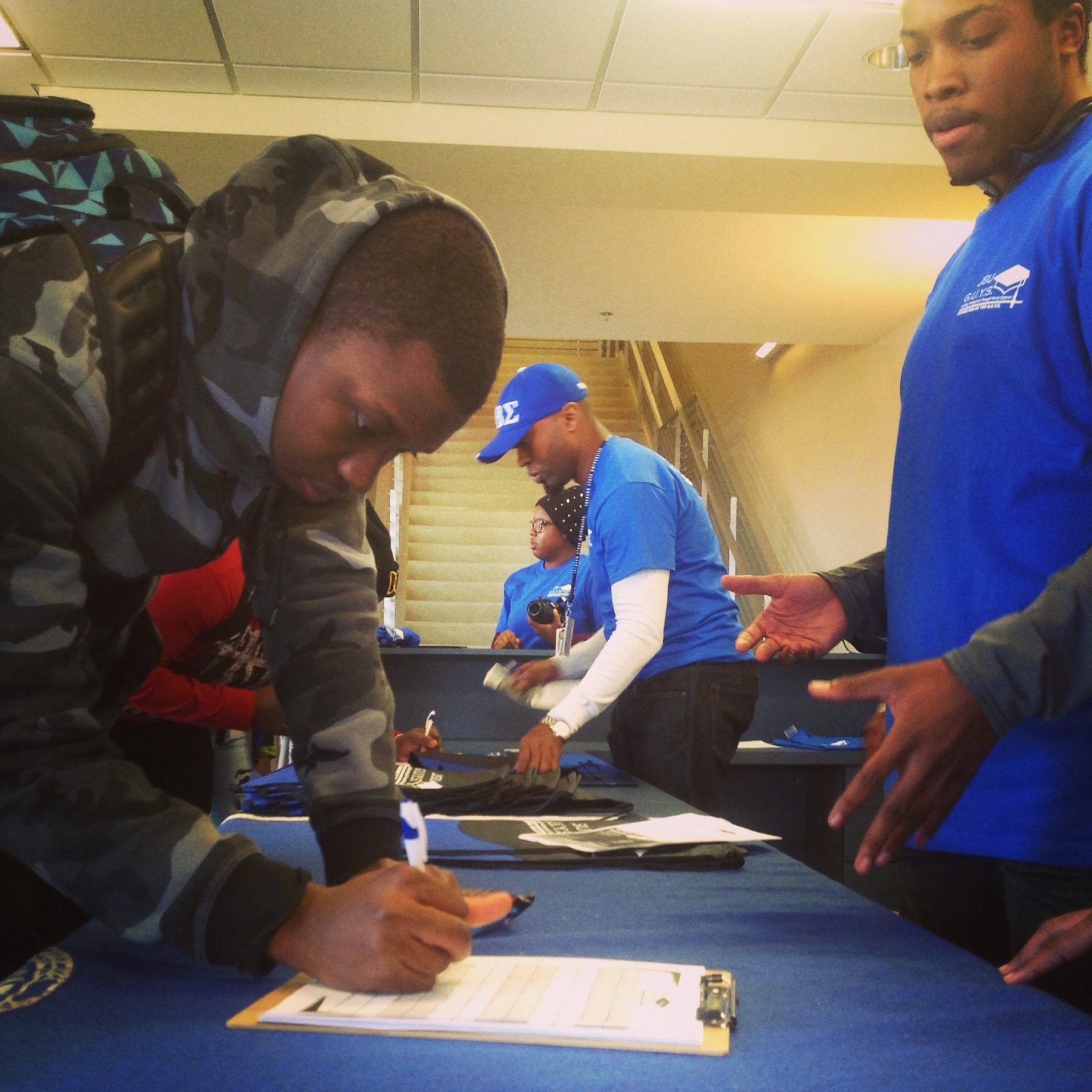 Washington and volunteers were camped out at the student center for more than two hours, giving away T-shirts and backpacks and encouraging students to sign up for the project.