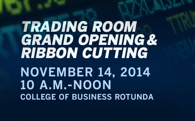 The grand opening and ribbon-cutting ceremony will be at 10 a.m. at the College of Business. Tours of the trading room explaining the software, historical and real-time market data tracking, portfolio analytics and other features will occur every 15 minutes.