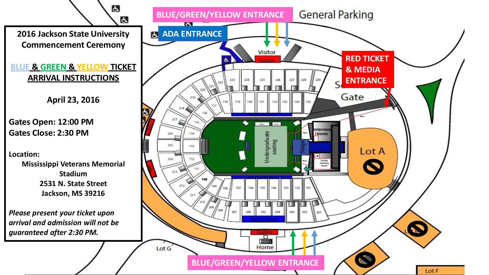 Stadium commencement entrance instructions for Blue, Green, Yellow ticketholders