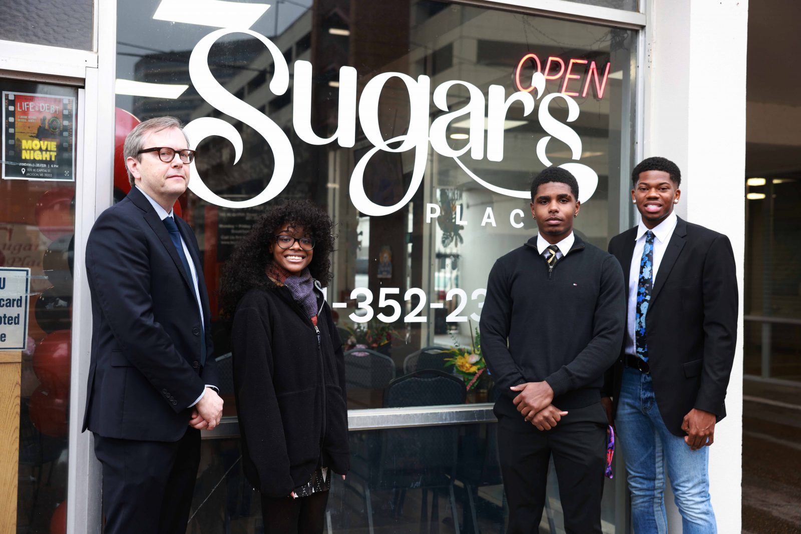 (L-R) Mark Geil, interim chair for JSU's Department of Art, with graphic design students Ashanti Stiff, Michael Brown, and Tyler Tremble in front of Sugar's Place downtown Jackson. Stiff created the logo and redesign for Sugar's Place. (William H. Kelly III/Jackson State University)